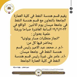 يقيم قسم هندسة النفط في كلية العمارة الجامعة بالتعاون مع قسم هندسة النفط في جامعة ميسان يوم الاثنين الواقع في ١٩/٦/٢٠٢٣ الساعة العاشرة صباحا ورشة علمية بعنوان : “انجاز متطلبات مسار بولونيا” يحاضر فيها كل من: -ا.م. د. محمد عبد الامير رئيس قسم هندسة النفط في جامعة ميسان. -ا.د. عامر