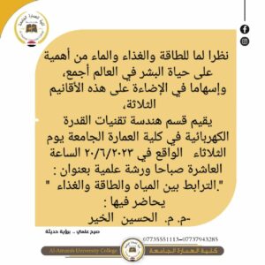 نظرا لما للطاقة والغذاء والماء من أهمية على حياة البشر في العالم أجمع، وإسهاما في الإضاءة على هذه الأقانيم الثلاثة، يقيم قسم هندسة تقنيات القدرة الكهربائية في كلية العمارة الجامعة يوم الثلاثاء الواقع في ٢٠/٦/٢٠٢٣ الساعة العاشرة صباحا ورشة علمية بعنوان : ‏ “.الترابط بين المياه والطاقة والغذاء “ يحاضر