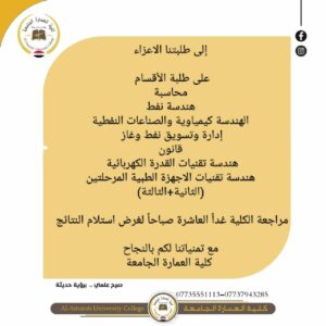 إلى طلبتنا الاعزاء على طلبة الأقسام محاسبة هندسة نفط الهندسة كيمياوية والصناعات النفطية إدارة وتسويق نفط وغاز قانون هندسة تقنيات القدرة الكهربائية هندسة تقنيات الاجهزة الطبية المرحلتين (الثانية+الثالثة) مراجعة الكلية غداً العاشرة صباحاً لغرض استلام النتائج مع تمنياتنا لكم بالنجاح كلية العمارة الجامعة