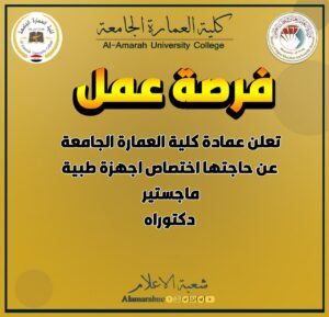Al-Amarah University College announces its need for the specialization of medical devices (PhD - Masters): Priorities required for submission: - Personal documents with a copy. University for retirement with ID