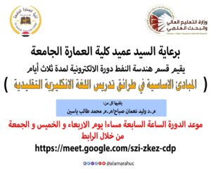 يقيم قسم هندسة النفط دورة الالكترونية لمدة ثلاث أيام بعنوان المبادئ الاساسية في طرائق تدريس اللغة الانكليزية التقليدية يلقيها كل من م.د وليد نعمان صباحم.م محمد طالب ياسين موعد الدورة الساعة السابعة مساءا يوم الاربعاء و الخميس و الجمعة المصادف 2022/3/11من خلال الرابط https://meet.google.com/szi-zkez-cdp