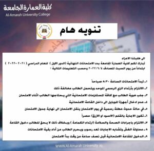 بدء الامتحانات النهائية (الدور الاول) في كلية العمارة الجامعة للعام الدراسي (٢٠٢١ – ٢٠٢٢ ) ابتداءا من يوم السبت المصادف ٢٠٢٢/٦/٤