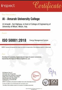 Al-Amarah University College obtained the ISO 50001 Energy Management System certificate after meeting the requirements for obtaining this certificate. We hope that this certificate will be an incentive for everyone to rise to the highest levels and perform well in order to obtain outputs that are important in building our dear homeland.