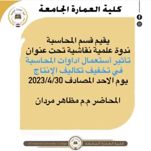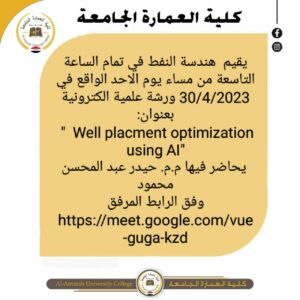 يقيم هندسة النفط في كلية العمارة الجامعة في تمام الساعة التاسعة من مساء يوم الاحد الواقع في 30/4/2023 ورشة علمية الكترونية بعنوان ” Well placment optimization using AI” يحاضر فيها م.م. حيدر عبد المحسن محمود وفق الرابط المرفق https://meet.google.com/vue-guga-kzd